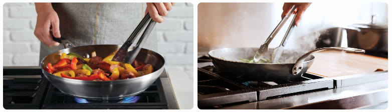 • Cast Iron: Heavy but holds heat well. Great for high-heat cooking like frying steak. It can become non-stick with use.
